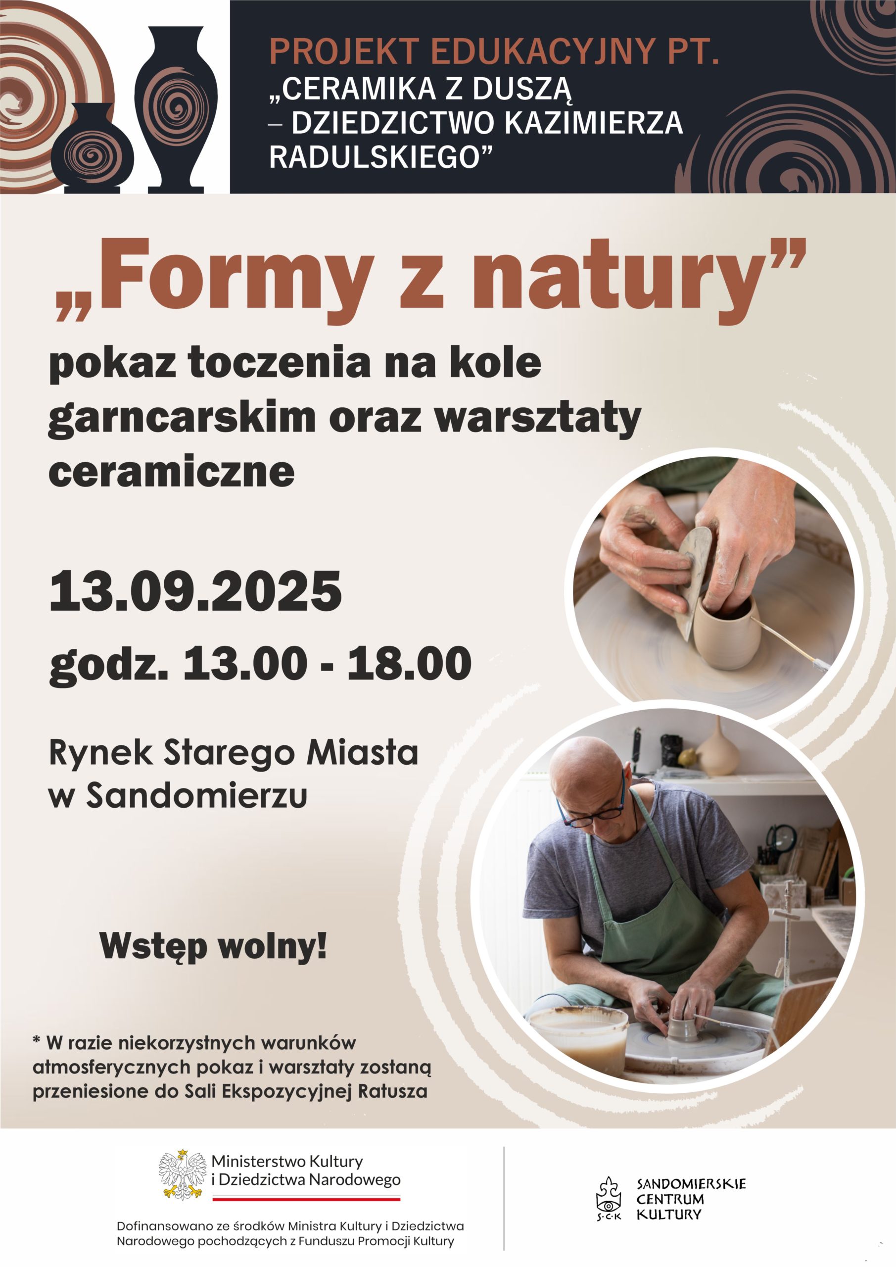 W ramach projektu edukacyjnego „Ceramika z duszą – dziedzictwo Kazimierza Radulskiego” odbędzie się wyjątkowy pokaz „Formy z natury”, podczas którego będzie można zobaczyć toczenie na kole garncarskim oraz wziąć udział w warsztatach ceramicznych prowadzonych przez uznanych twórców – Roberta i Monikę Jehn-Olszewskich.