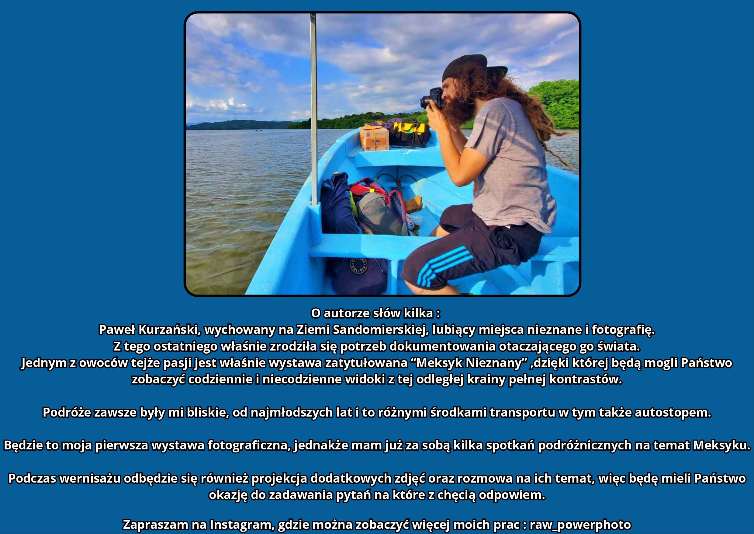 Podróże zawsze były mi bliskie, od najmłodszych lat i to różnymi środkami transportu w tym także autostopem. Będzie to moja pierwsza wystawa fotograficzna, jednakże mam już za sobą kilka spotkań podróżniczych na temat Meksyku.