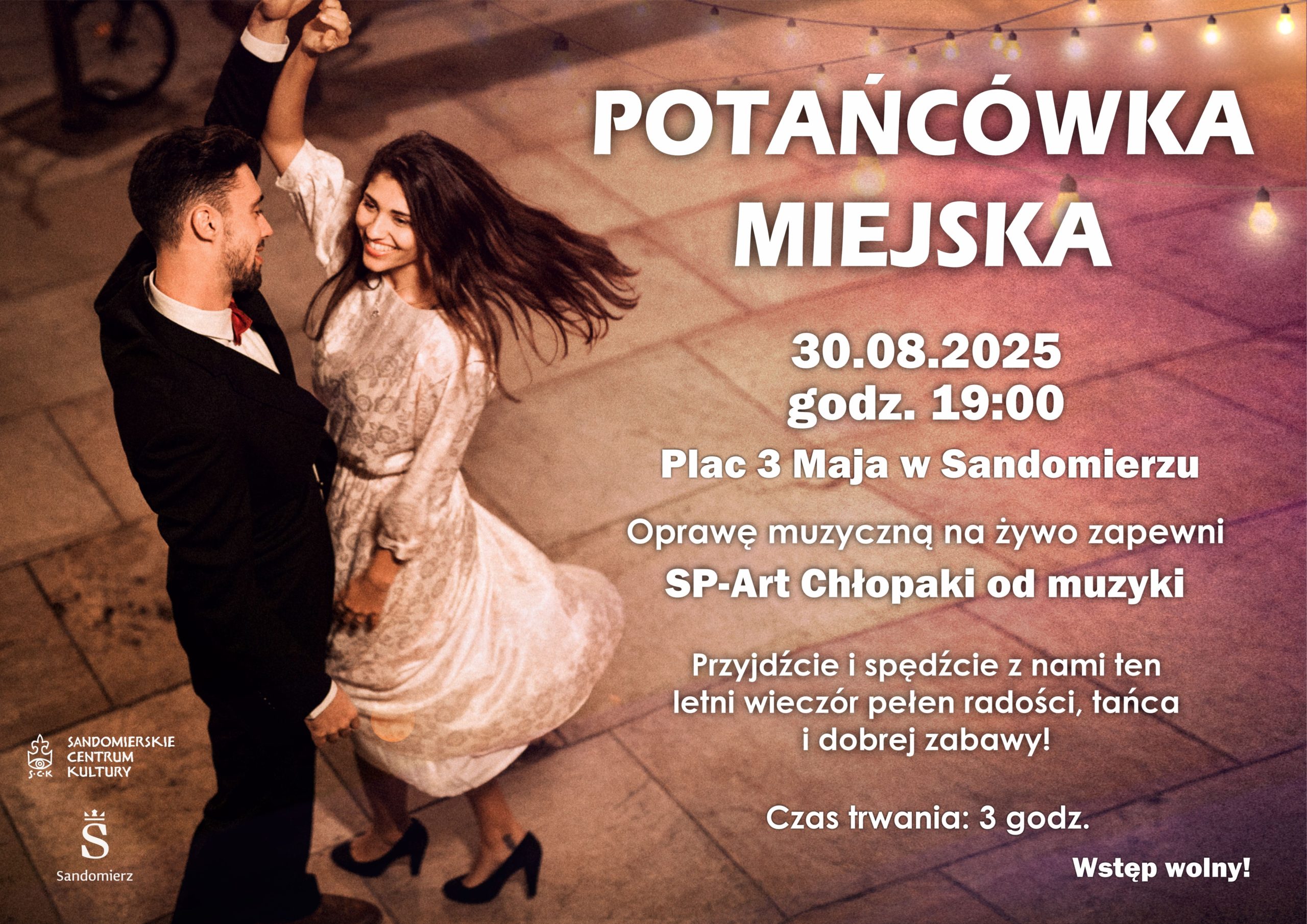 Klub senioraSandomierskie Centrum Kultury oraz Urząd Miejski w Sandomierzu serdecznie zapraszają mieszkańców oraz gości naszego miasta na wyjątkowe wydarzenie – Miejską Potańcówkę, która odbędzie się w sobotę, 30 sierpnia 2025, o godzinie 19:00 na Placu 3 Maja w Sandomierzu.