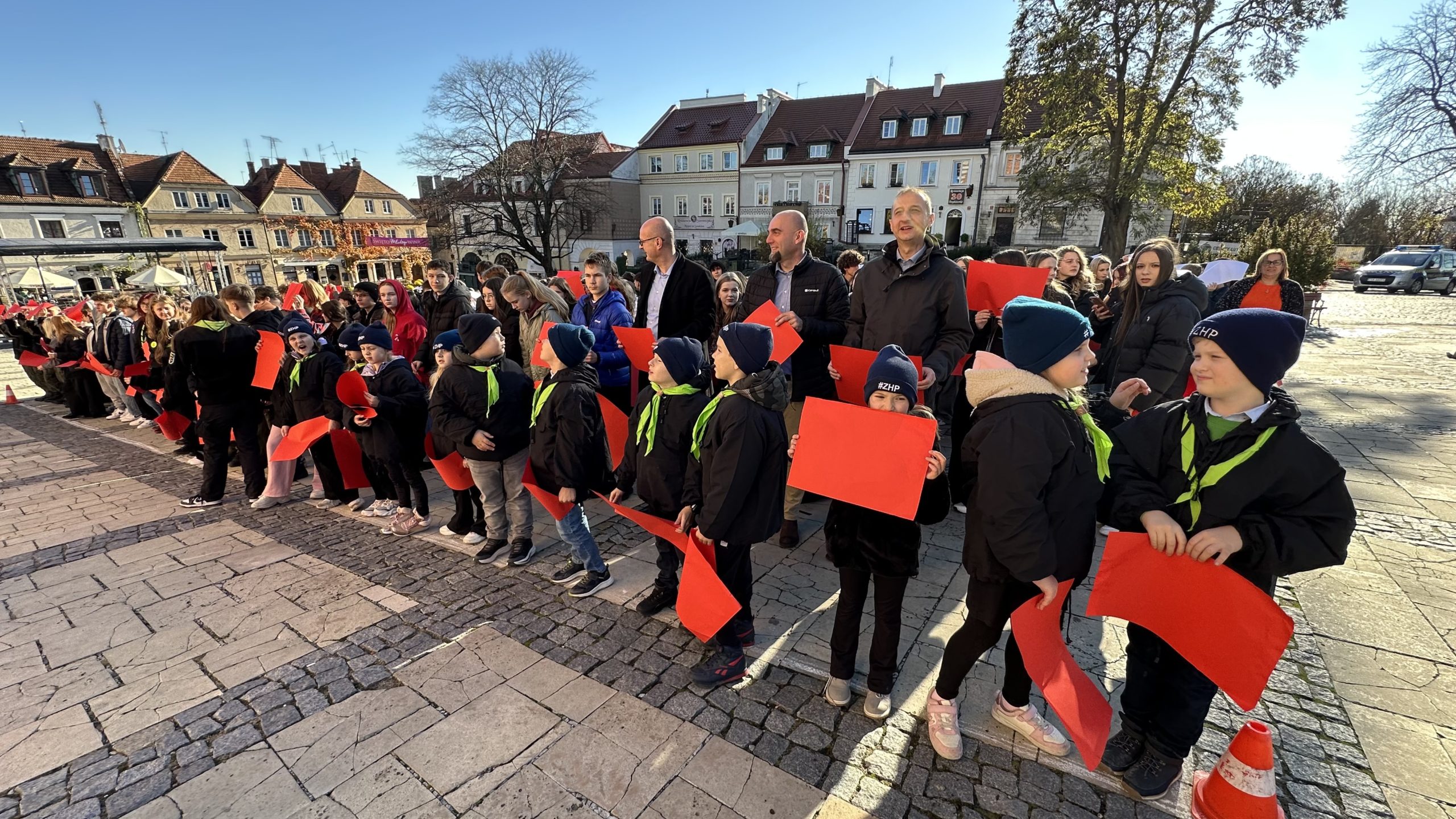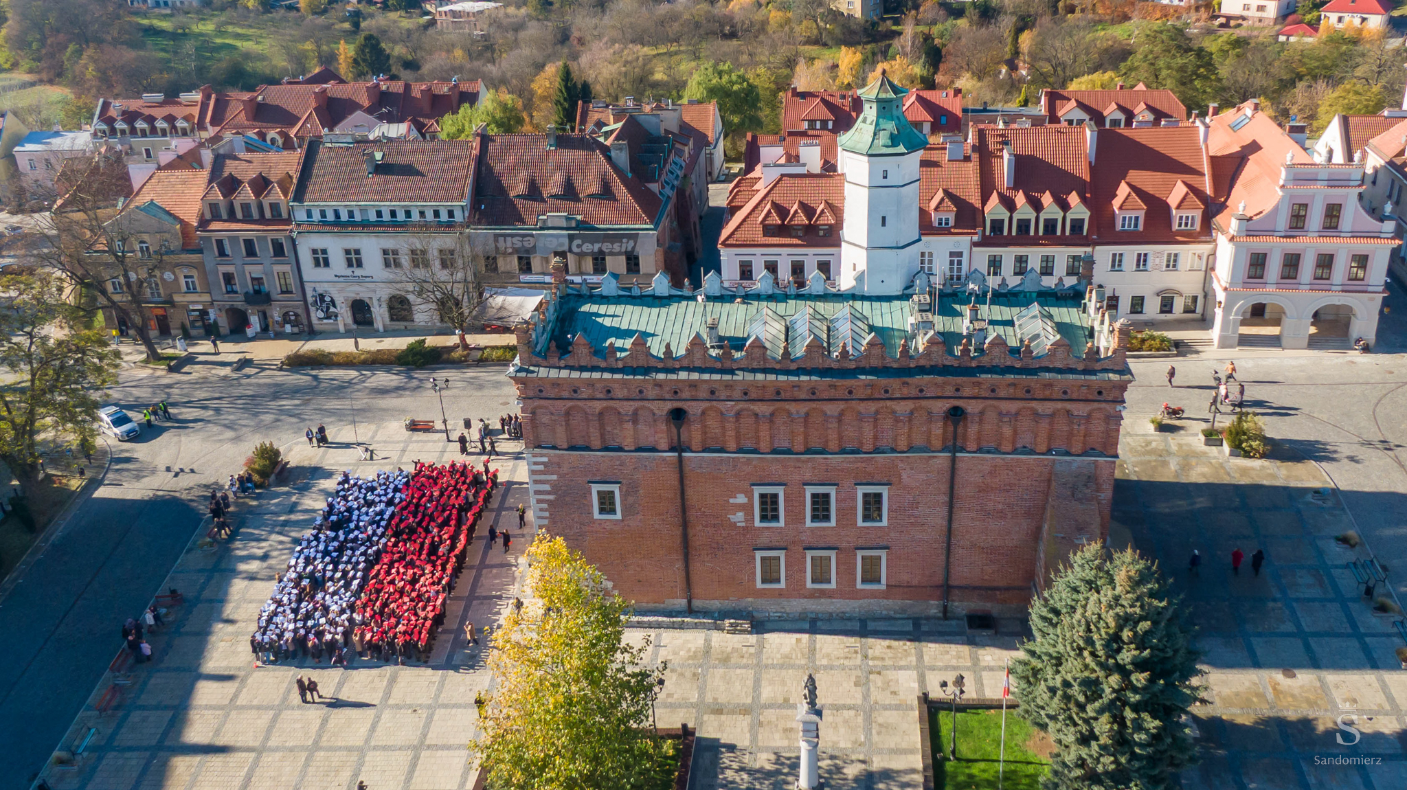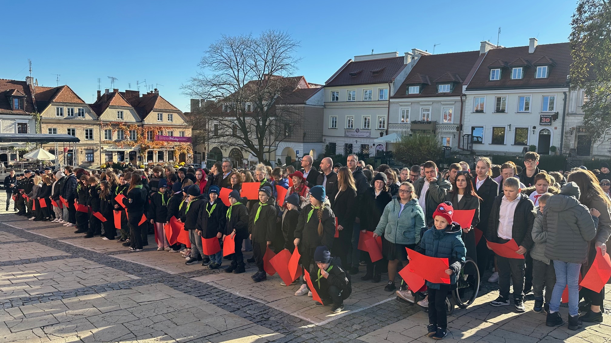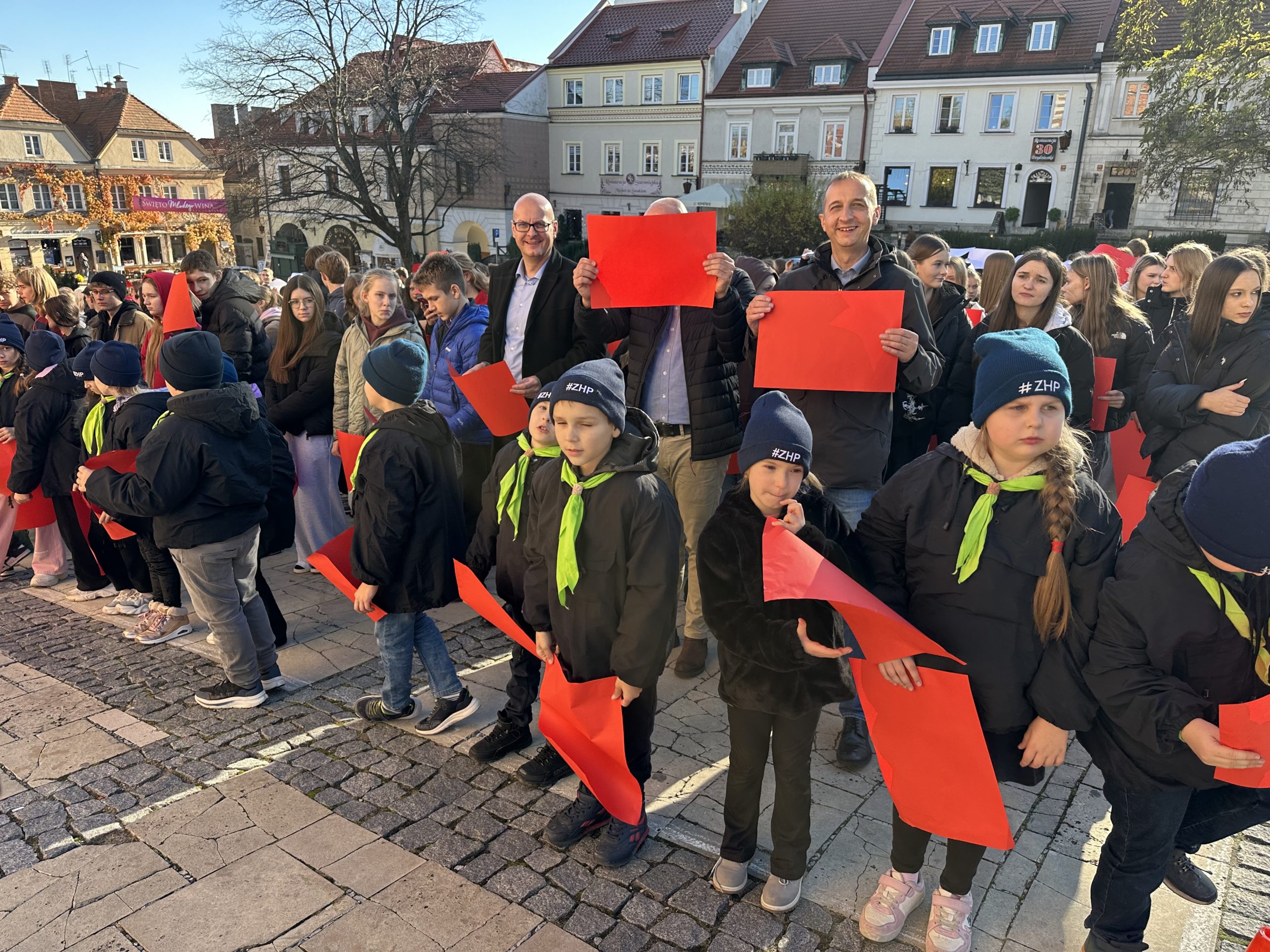 w piątek, 7 listopada 2025, na sandomierskim Starym Mieście odbyła się kolejna edycja patriotycznego happeningu „Żywa Flaga”, która tradycyjnie zgromadziła liczne grono uczestników. W wydarzeniu wzięło udział około 550 osób, które wspólnie utworzyły biało-czerwoną flagę oraz odśpiewały hymn Polski..